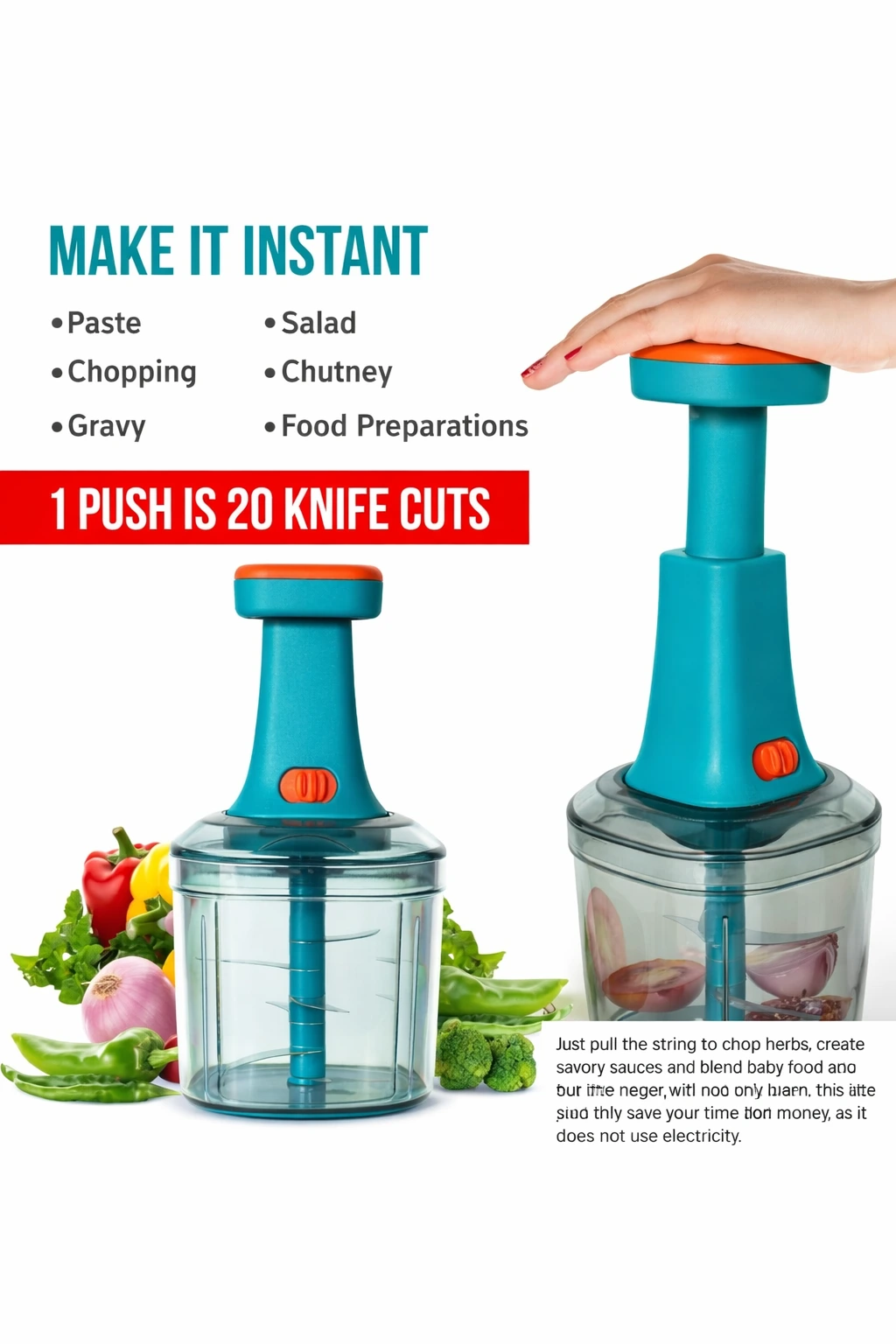 Best of all, it works completely without electricity, making it eco-friendly and convenient to use anywhere. Easy to clean and durable, this manual chopper is a must-have tool for anyone who loves cooking smartly and efficiently.