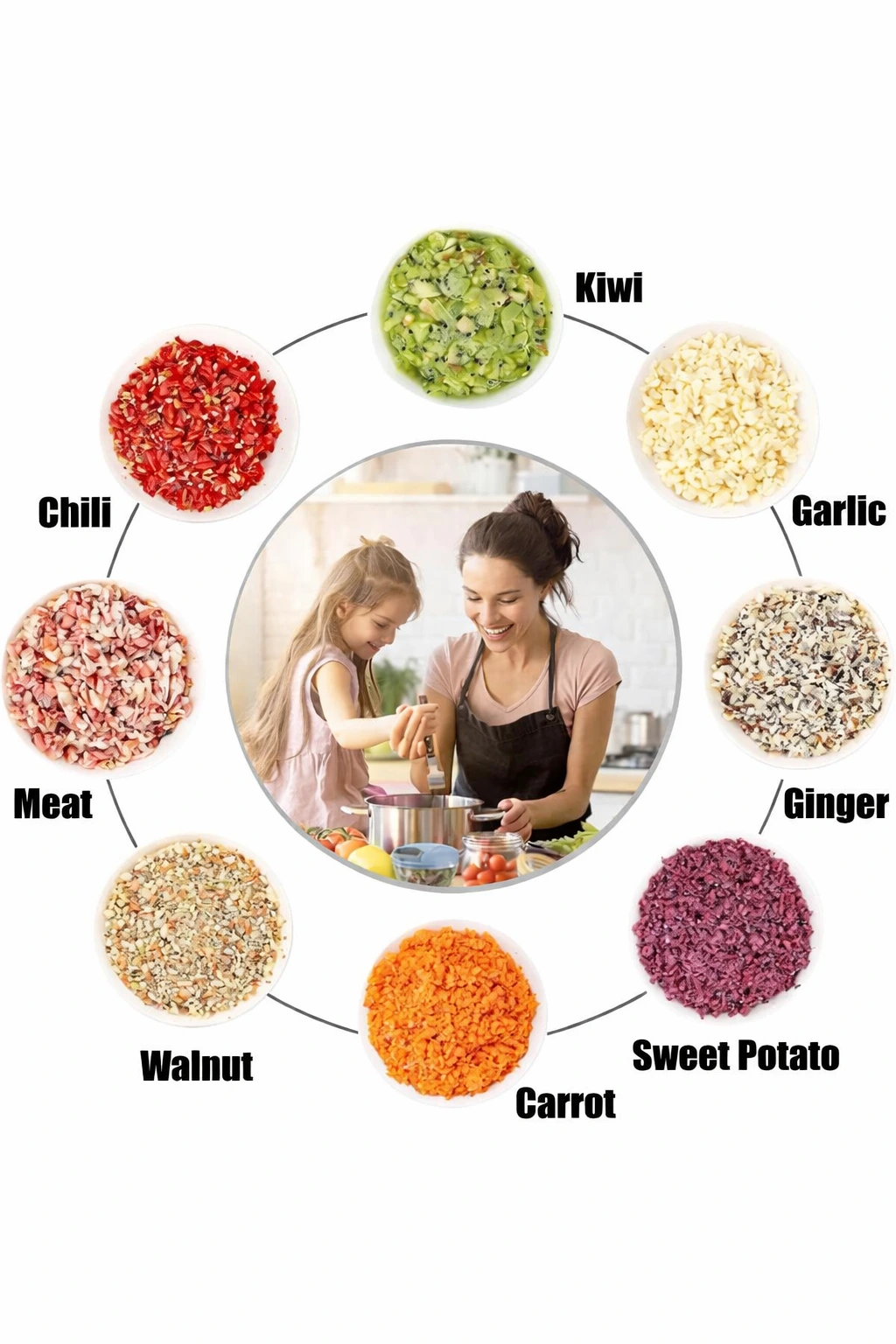 Make your kitchen work faster, smarter, and more enjoyable with this powerful manual vegetable chopper. Designed for versatility, it effortlessly chops a wide variety of ingredients—from crunchy carrots and sweet potatoes to garlic, ginger, and even nuts. Whether you’re preparing spicy chili, fresh kiwi salads, or finely chopped meat, this chopper handles it all with ease.